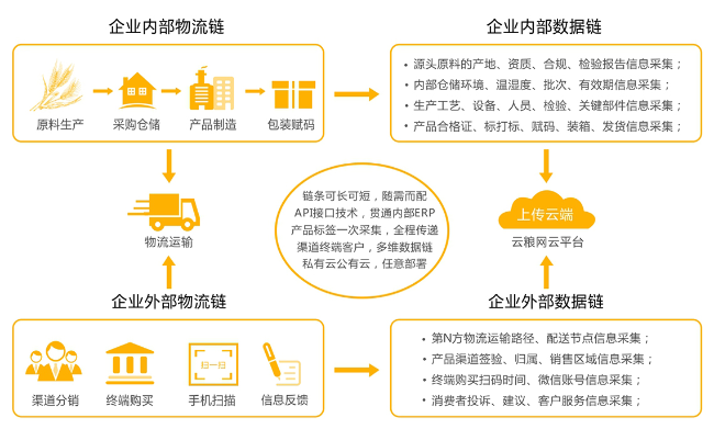 粮食协会防伪追溯平台,是基于条码、RFID识别技术,以身份标签为载体,对产品进行一物一码、一品一码的标识, 进而对每个产品在生产、 物流、分销、终端市场等各数据源进行采集,联动,从而将产品在企业内、外的物流链串联为数据链。 通过对整条数据链不同环节的提取、 分析、应用,达到产品防伪鉴真、渠道防窜货、质量追溯,营销互动管理等功能。