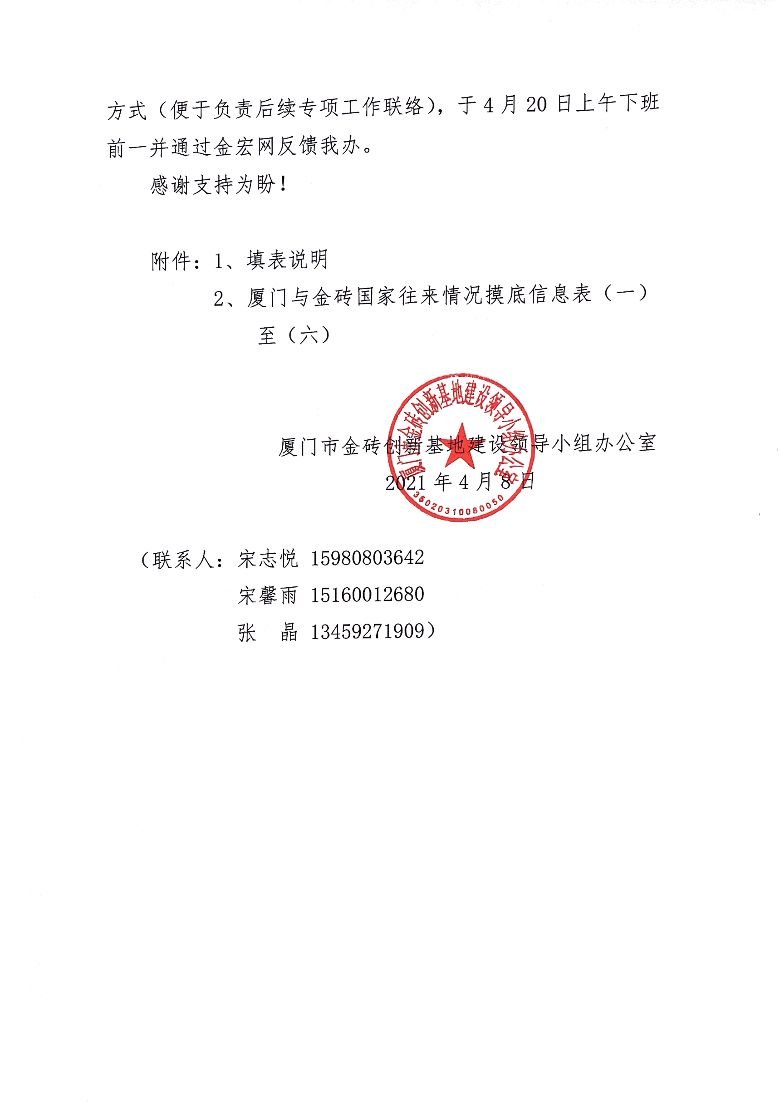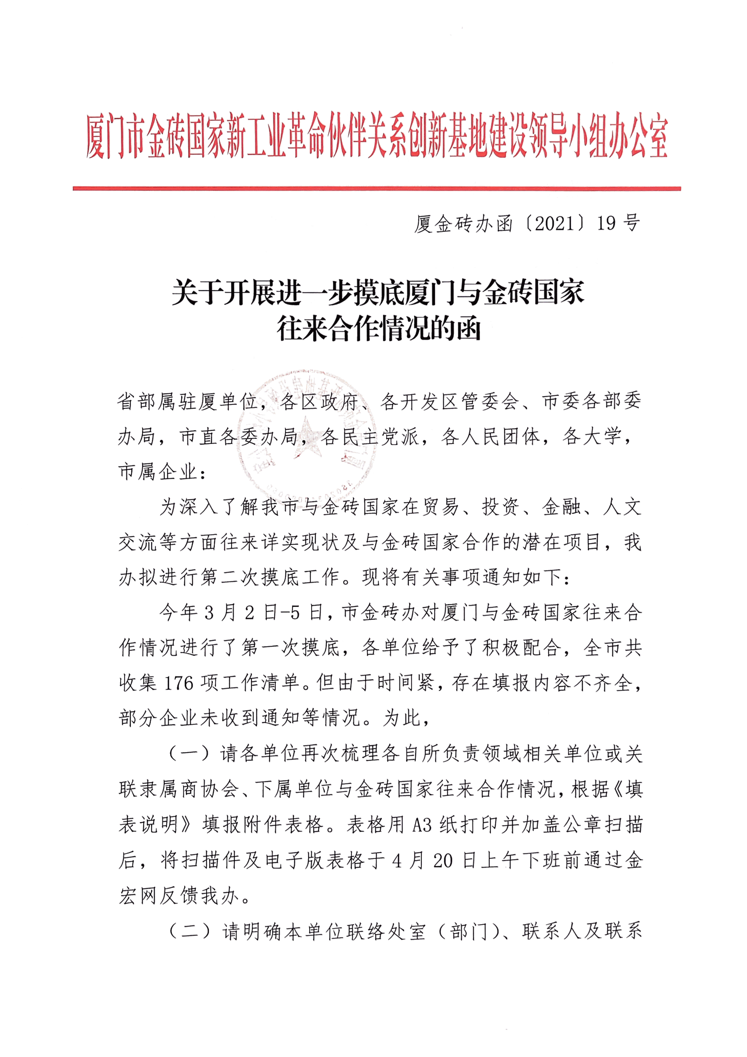 为深入了解我市与金砖国家在贸易、投资、金融、人文、交流等方面往来详实现状及与金砖国家合作的潜在项目,现收到市金砖办《关于开展进一步摸底厦门与金砖国家往来合作情况的函》的文件,现将相关文件、填报表格、填报说明等发给各会员企业,请大家积极参与金砖活动,自行下载填报,相关表格请于4月20日上午10点之前通过微信或邮箱方式,报至秘书处汇总。联系人:傅琳琳 黄琳