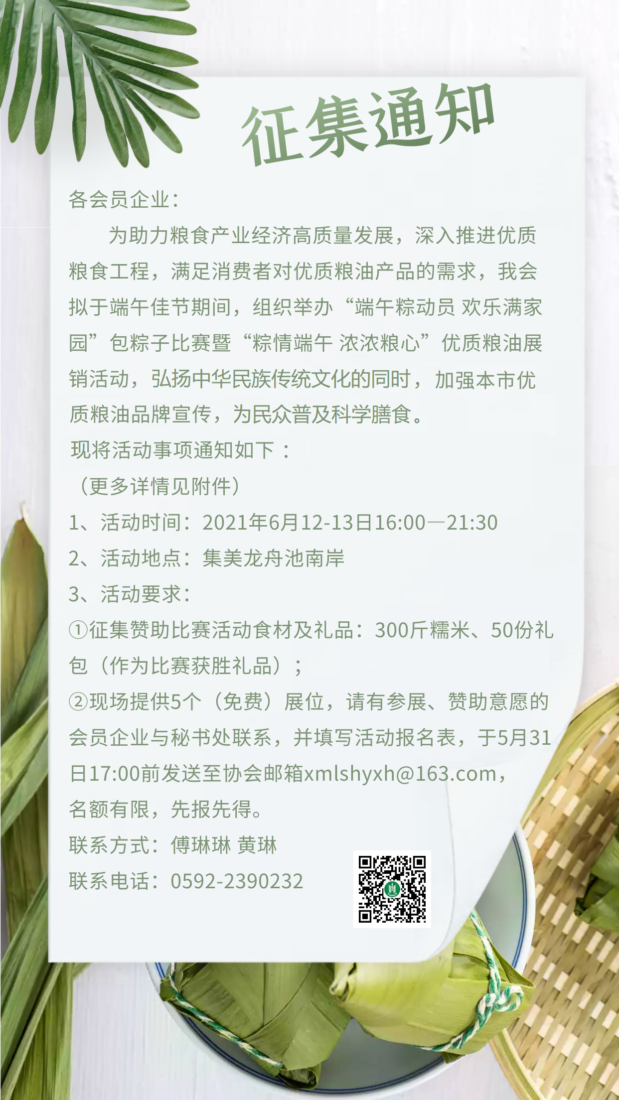 粮协通知 | 厦粮协关于开展“端午粽动员 欢乐满家园”包粽子比赛暨“粽情端午 浓浓粮心”优质粮油展销活动的通知