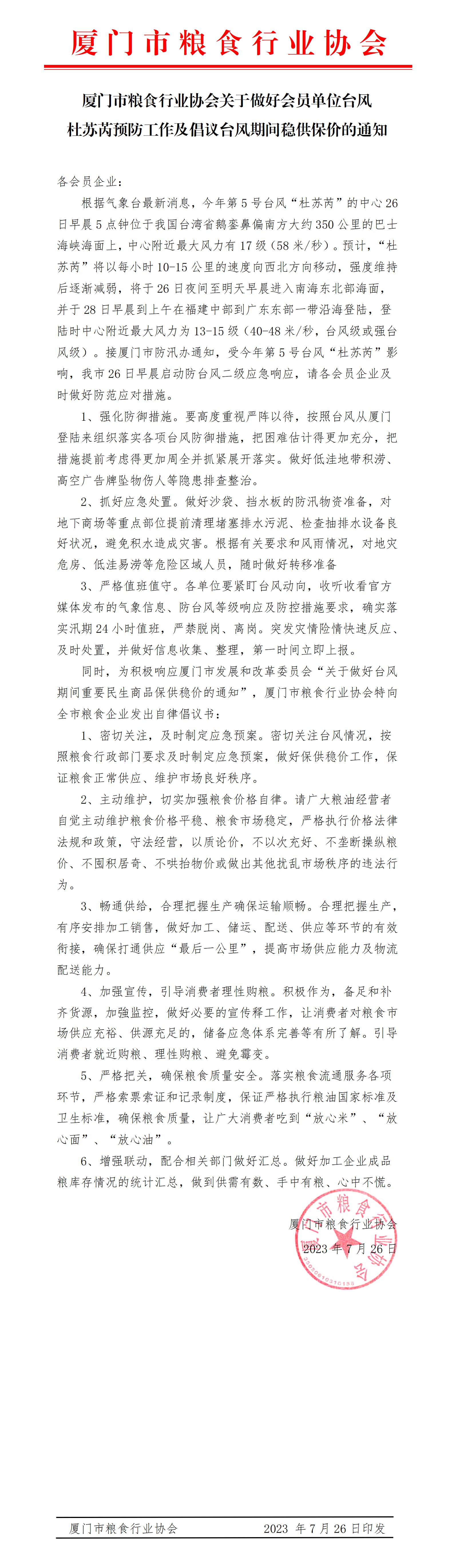 厦门市粮食行业协会关于做好会员单位台风杜苏芮预防工作及倡议台风期间稳供保价的通知