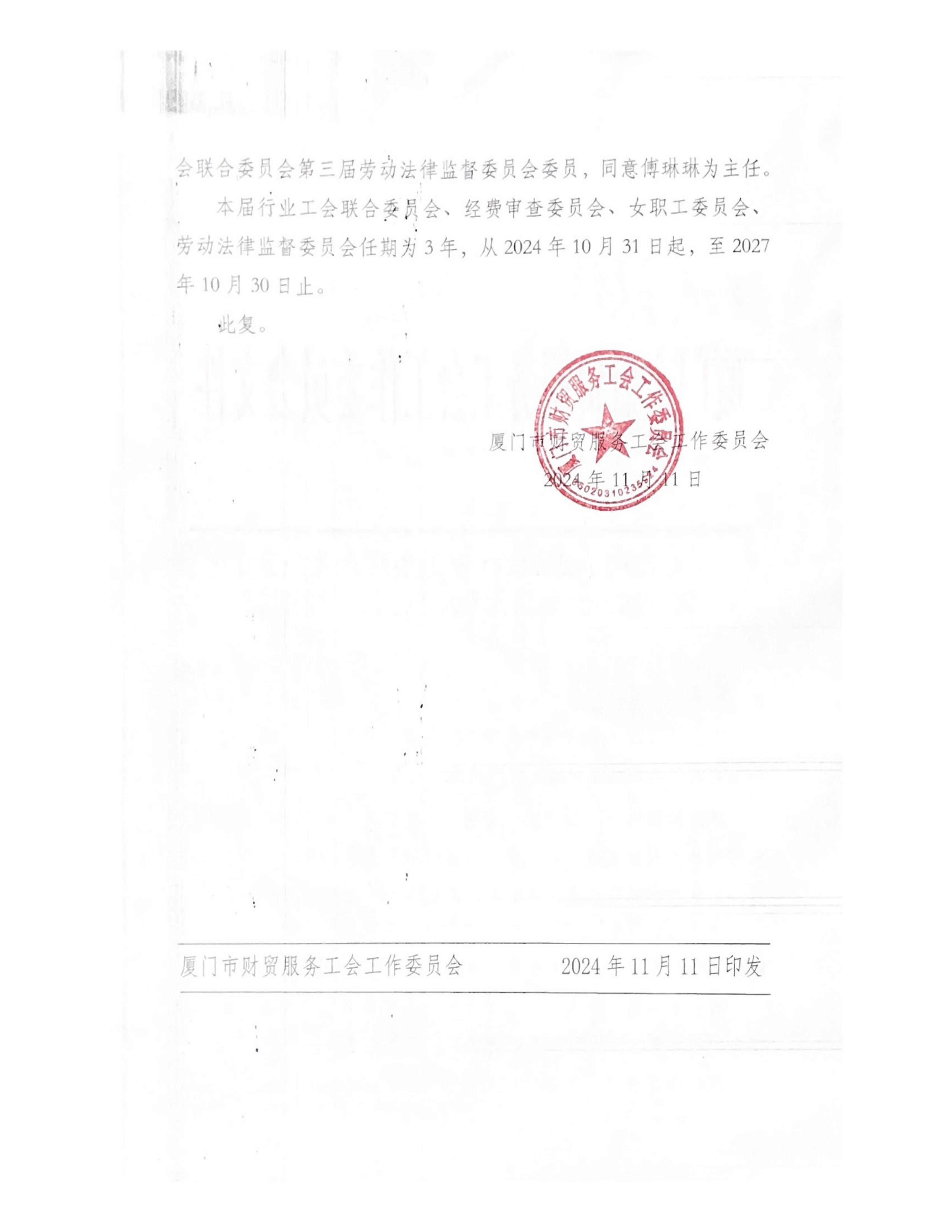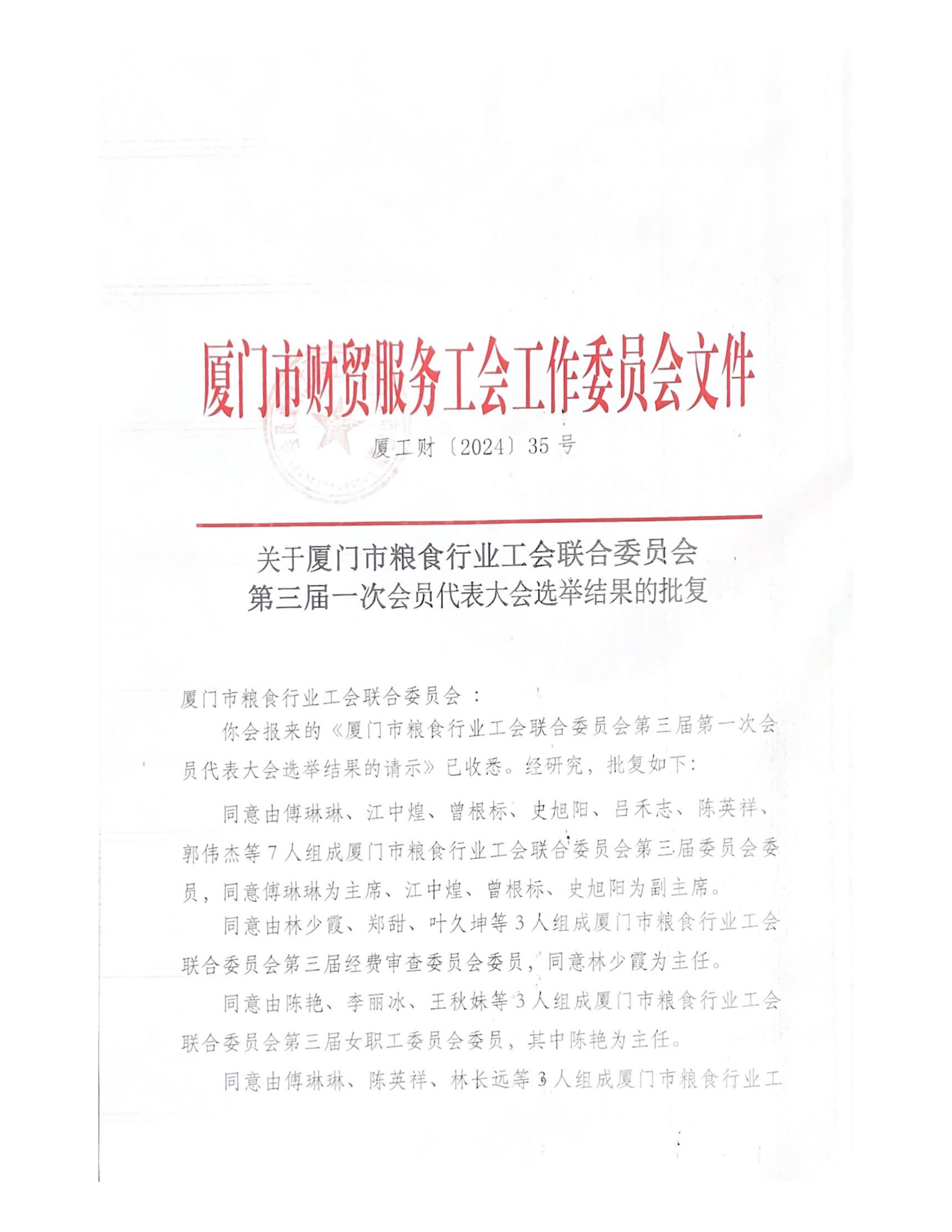 关于厦门市粮食行业工会联合委员会第三届一次会员代表大会选举结果的批复